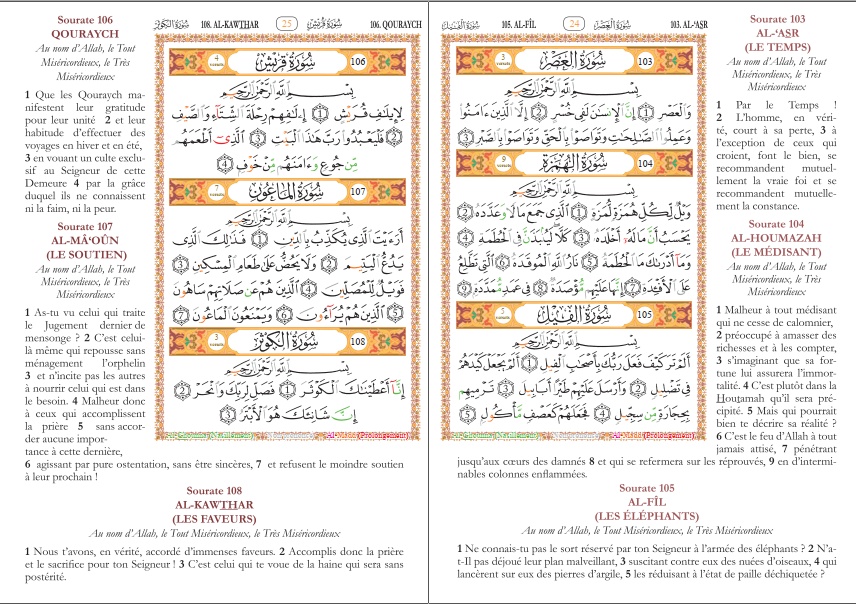 Les règles de tajwîd simplifiées sont expliqués à la fin du livre et le système des couleurs permet de savoir comment prononcer les lettres.