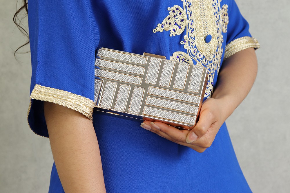 Sac à main rigide avec strasse élégant et léger à porter. Parfait pour événement spécial : mariage, soirée, cérémonie, fêtes... Ce sac rectangulaire ciselé. Bandoulière métallique. Fermeture par fermoirs-pression.