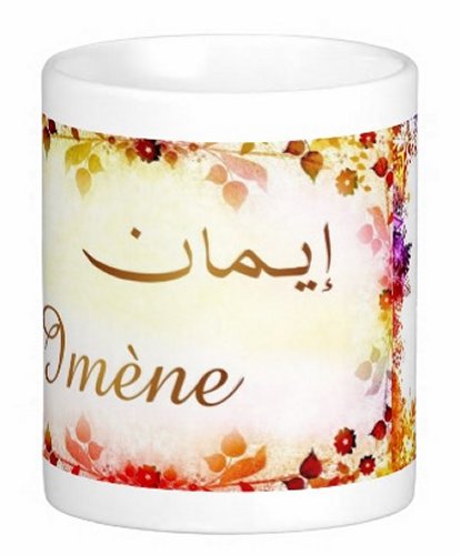Mug avec le prénom "Imène" écrit en français, en arabe (إيمان) et calligraphié de façon artistique en arabe sur la partie droite.