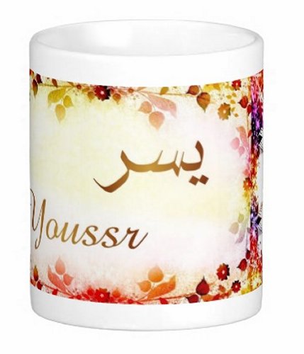 Mug avec le prénom "Yousr" écrit en français, en arabe (يسر) et calligraphié de façon artistique en arabe sur la partie droite.