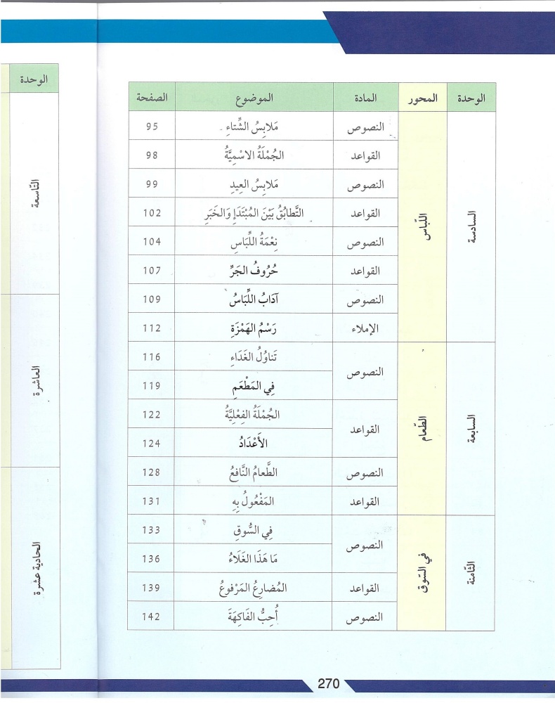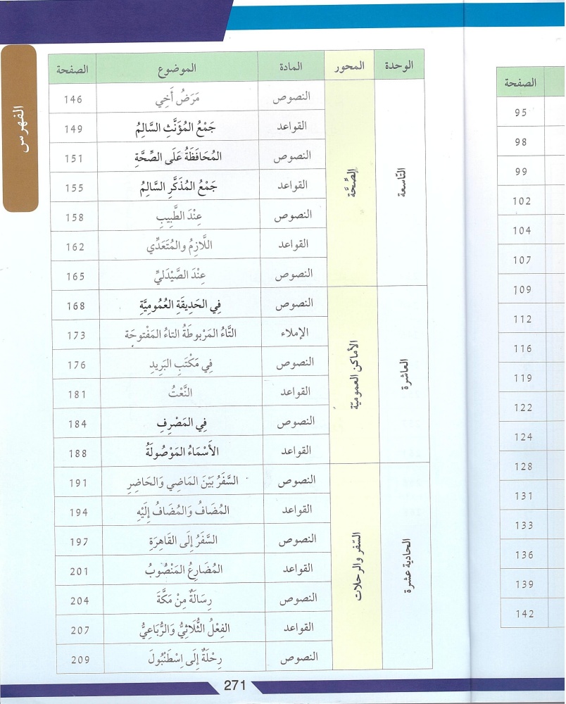 الكتاب الأول تحت عنوان "من الحرف إلى النص" و يتكون من 243 صفحة مقسمة على 8 مجموعات والكتاب الثاني تحت عنوان "كتاب النصوص و القواعد" مقسمة على 13 وحدة و يتكون من 272 صفحة.