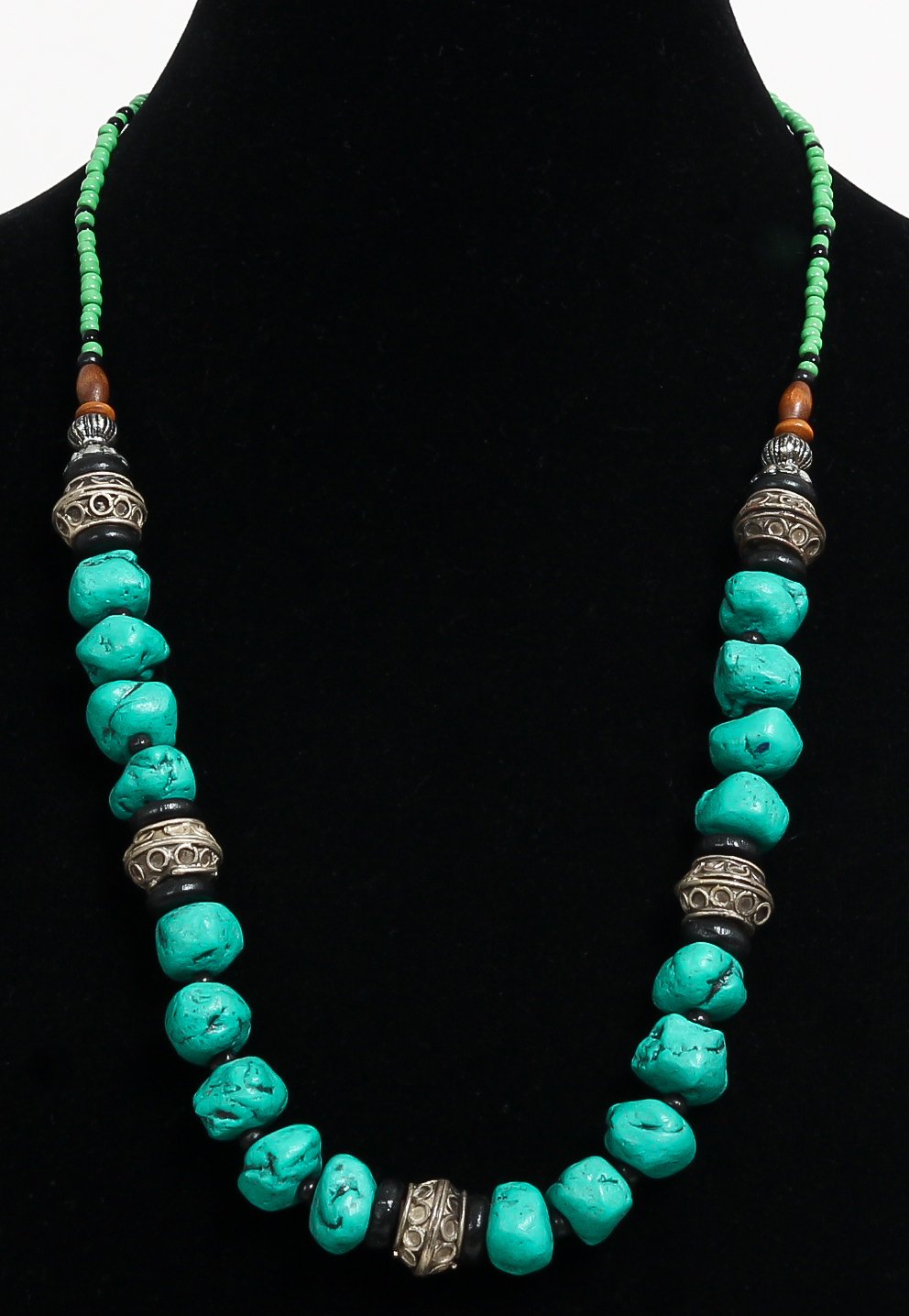 Collier ethnique artisanal imitation boules turquoises difformes séparées de perles en métal et composé d'autres perles noires et blanches - REF. 18942 (14.00 €)
