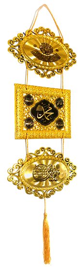Les éléments du tableau contiennent les inscriptions suivantes : Mohammed, sourate al-Ikhlas (la sincérité) et sourate al-Falaq (l'aurore).