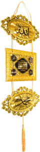 Les éléments du tableau contiennent les inscriptions suivantes : le nom d'allah , mohammad , al-chahada (l'attestation de foi) et les trois sourates Qoul ( il s'agit des 3 dernières sourates du coran qui ont la vertu de protéger contre tous mal).