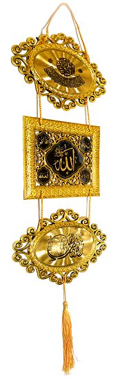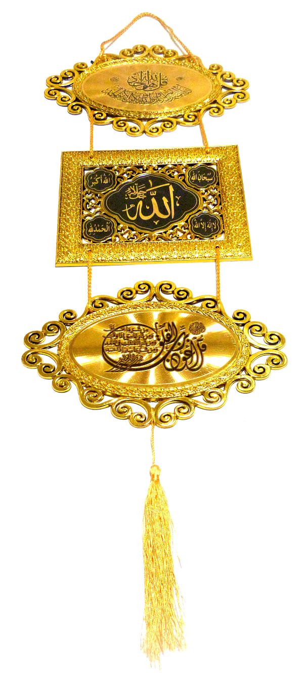Les éléments du tableau contiennent les inscriptions suivantes : Allah jalla jalâlouh, sourate al-Falaq et sourate Al-Ikhlass. Ces 2 dernières sourates correspondent aux sourates protectrices.
