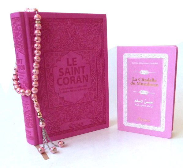 Pack Cadeau Couleur Rose : Le Saint Coran (francais/arabe/phonetique) + La Citadelle du musulman + Chapelet "Sebha" de luxe rose