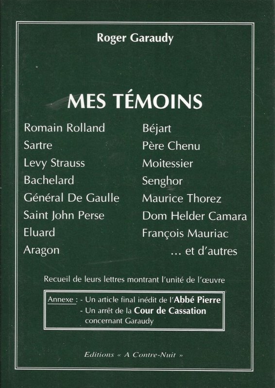 Ces lettres adressées à Roger Garaudy par de grands intellectuels qui ont contribué à faire sur le plan politique, religieux ou esthétique -, le Xxème siècle, sont des documents précieux pour comprendre notre temps. D'abord, parce que, par leur caractère personnel, elles révèlent du dedans, par exemple , la pensée profonde de Romain Rolland sur le dialogue et la foi ; celle de Sartre sur les rapports du marxisme et de l'existentialisme ; celle de Levi Strauss sur le marxisme et le structuralisme. Ne manqueront pas d'étonner, dans ces lettres, les conceptions de Dom Helder Camara sur la danse ou celles de Garaudy sur Jésus. Elles montrent aussi la continuité de la pensée et de l'action de Garaudy qui n'a jamais renié ses espérances. En annexe, un article inédit de l'Abbé Pierre, destiné au Monde et non publié par ce journal, montre son opinion dernière sur le lobby qui voulait étouffer sa voix et celle de Garaudy. Enfin le texte in extenso d'un arrêt de la cour de cassation, condamnant la LICRA pour son accusation d'antisémitisme contre Garaudy, le Père Lelong, le Pasteur Matthiot et Jacques Fauvet, découvre les raisons du lynchage médiatique plus récent.