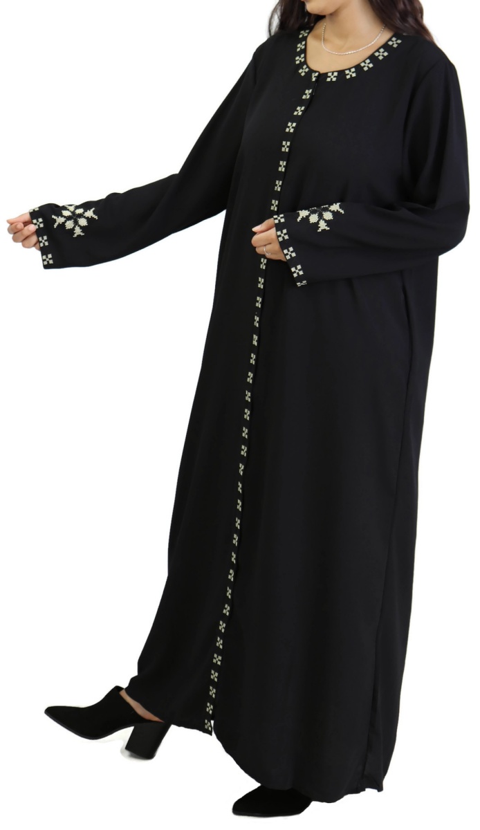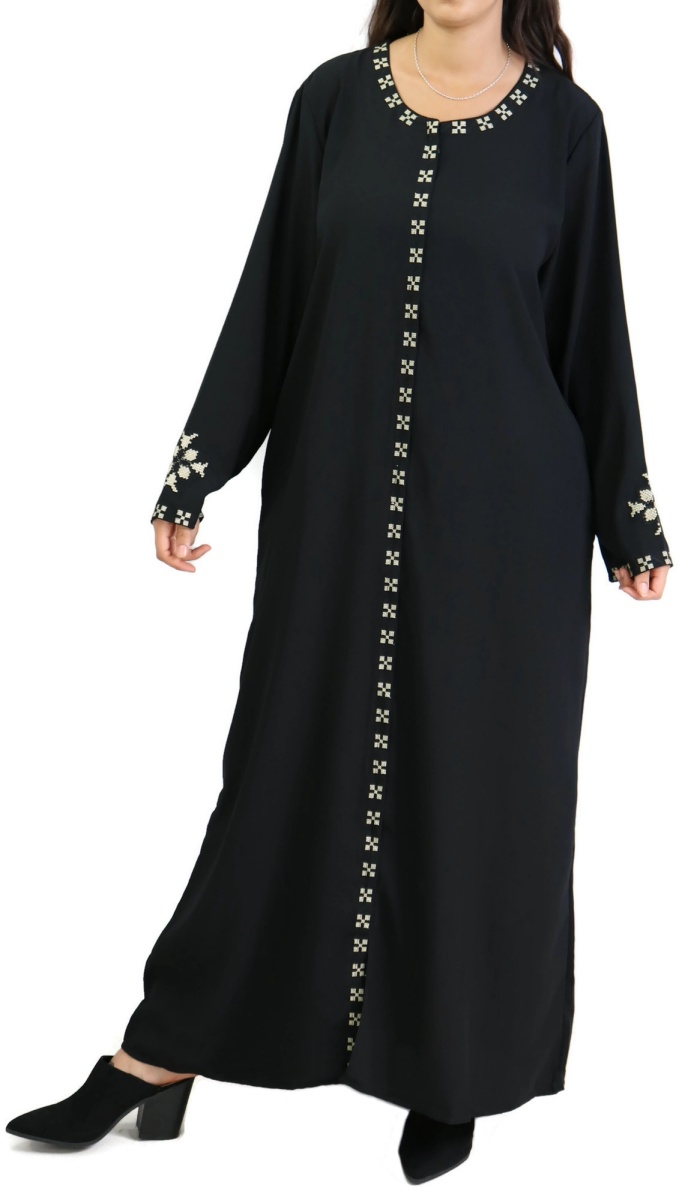 Robe longue col rond brodé, s'ouvre entièrement avec fermeture éclair décorée de broderies ainsi sur les poignets, poches latérales. Disponible dans différentes couleurs.