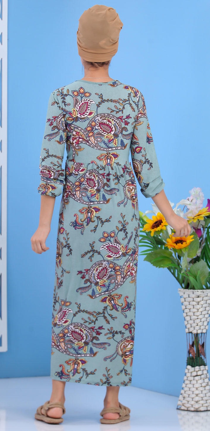Robe longue, col rond, manches finition élastiques aux poignets, taille froncée. Cette robe à imprimés "motifs cachemire" un style unique, oriental, tout simplement indémodable.
