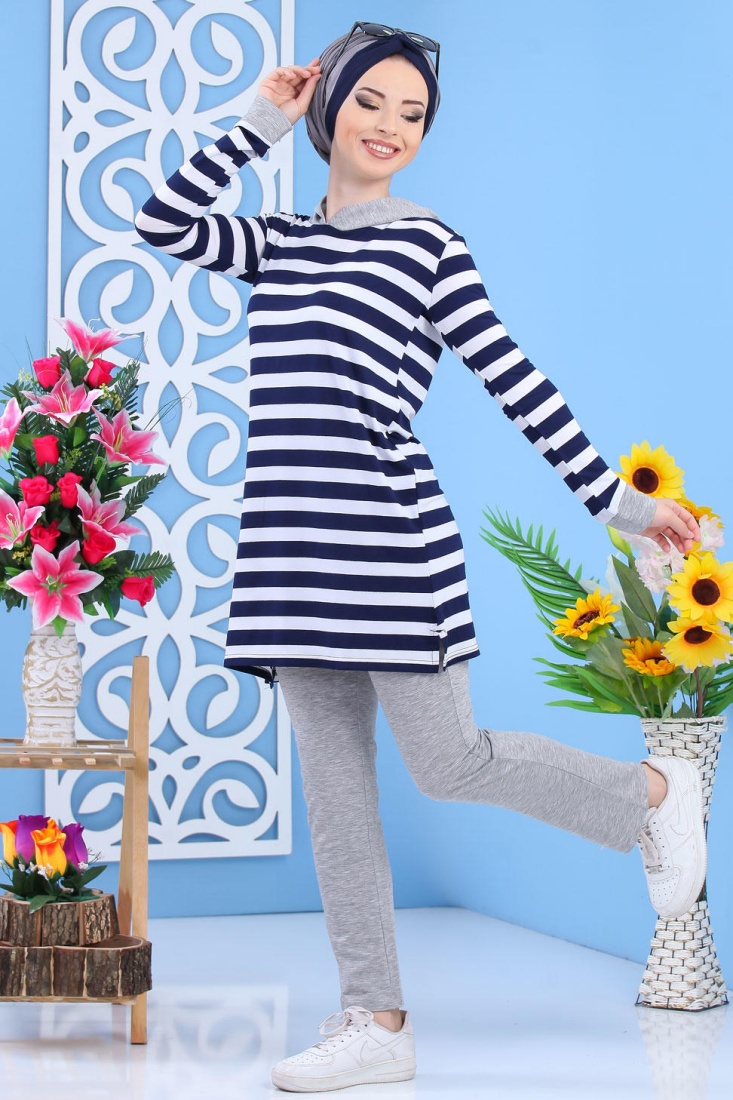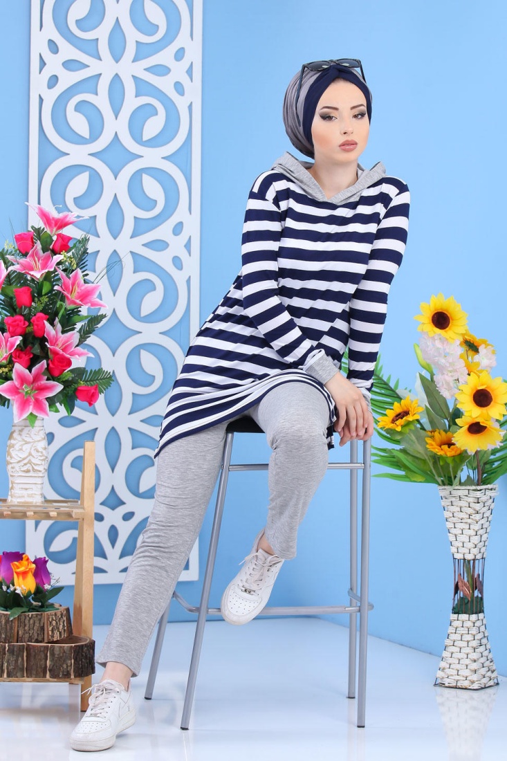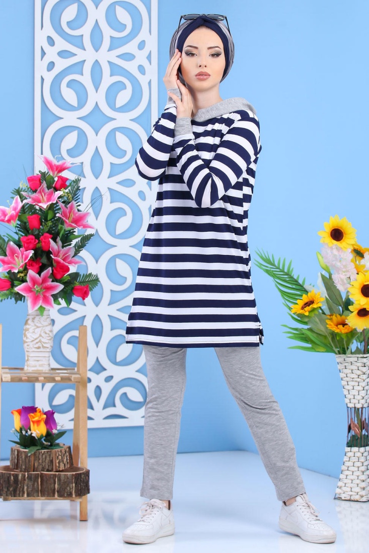 Ensemble décontracté pour femme : Pantalon Gris + Tunique de couleur blanche à rayures bleues marines Vetement & Accessoire