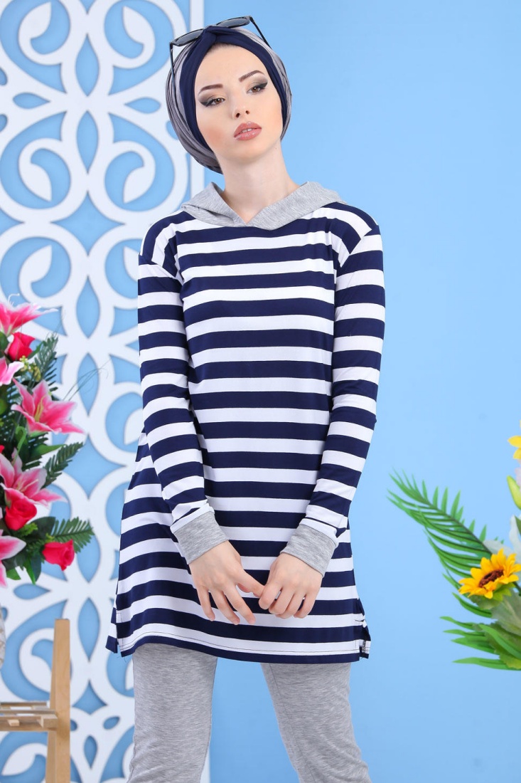 Robe longue à capuche style sweat shirt (Hijab sport pour femme musulmane) - Couleur bleu marine - REF. 32921 (29.00 €) - En Promotion à 22.90 €