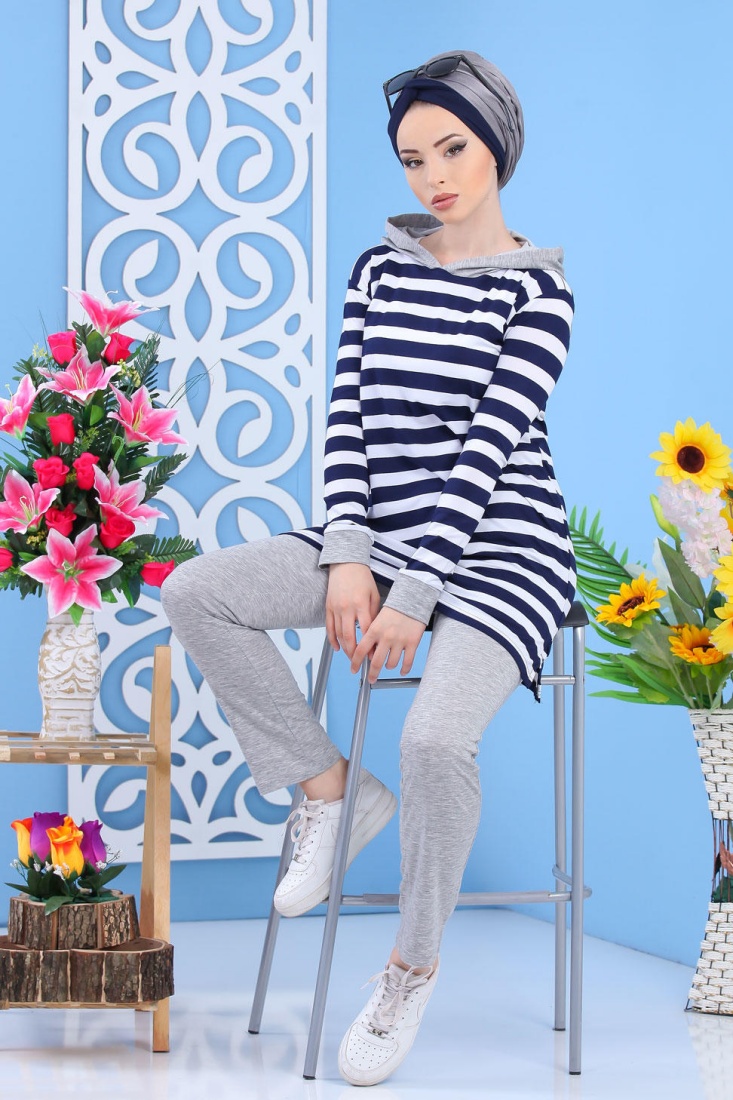 Ensemble decontracte pour femme : Pantalon Gris + Tunique de couleur blanche a rayures bleues marines