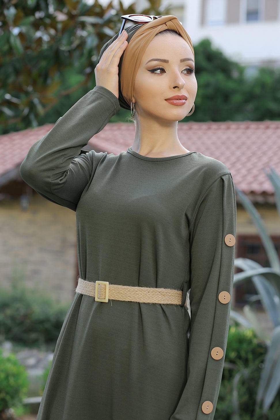 Robe longue, coupe droite, col rond, ceinture tissé à passants, manches avec décoration boutons, tissu effet crêpe. Ce modèle sobre et classique s'adapte pour diverses occasions et en toute saison.