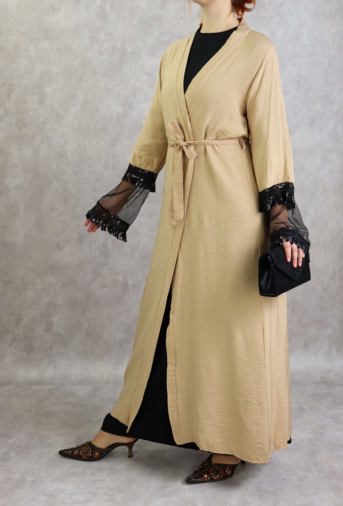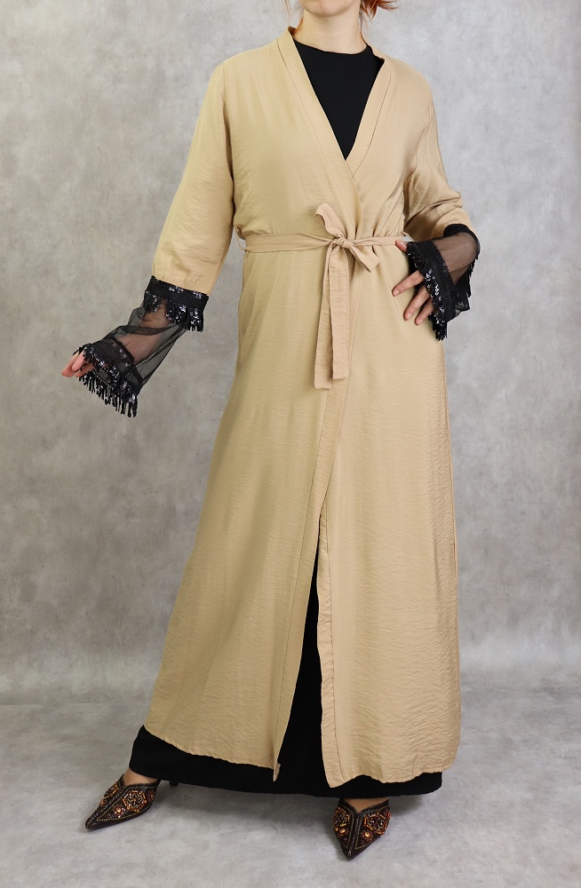 Kimono long plissé style oriental avec décorations et strass pour femme - Couleur caramel - REF. 33315 (32.00 €)