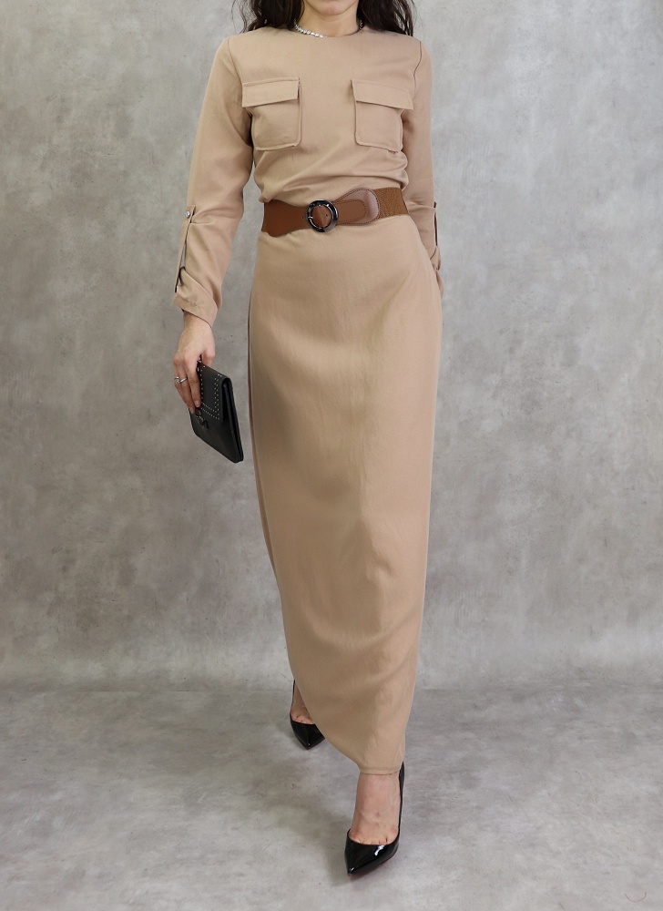 Robe longue, col rond, manches longues ajustables, deux poches plaquée au niveau de buste et poche latérale, fermeture éclair au dos, ceinture à passants, tissu léger non transparent, aussi douce que fluide.