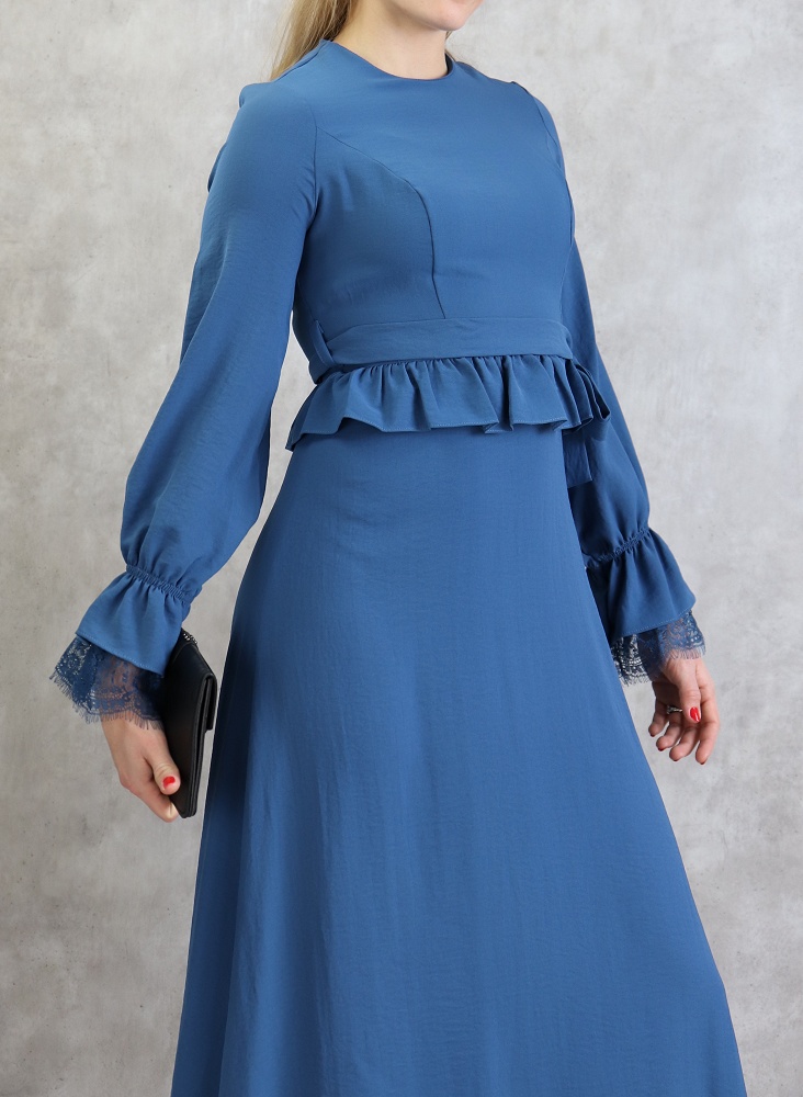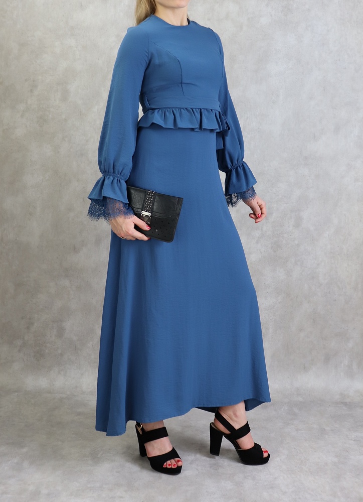 Robe longue évasée, col rond, fermeture glissière au dos, manches finition élastique froufrous et dentelles aux poignets, taille cintrée ornée d'un volant, ceinture assortie à passants, tissu doux, fluide et opaque.