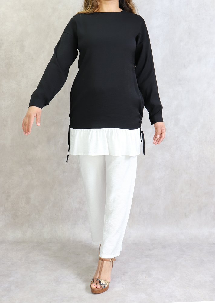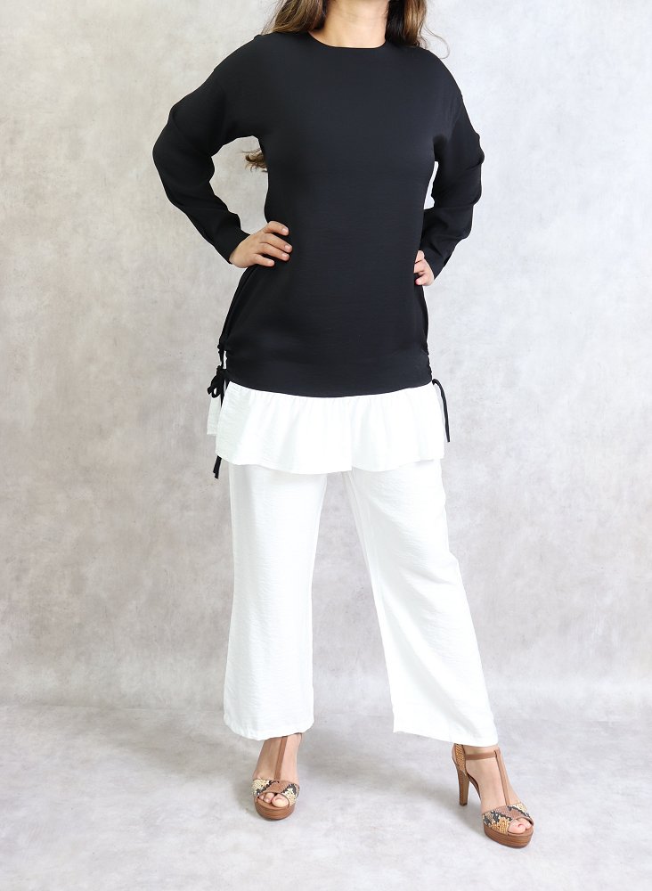 Tunique bicolore à volants, avec deux lien à attacher sur les cotés, coupe évasée, manches longues finition boutons.