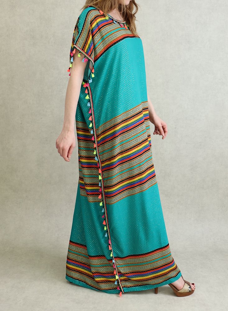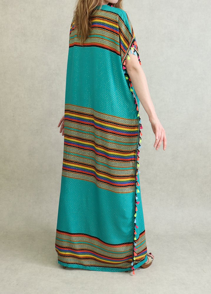 Robe orientale longue à rayures horizontales multicolores, mini pompon, paillettes brillantes sur toute la robe, coupe droite, col rond. On aime son tissu au toucher et un tombé fluide et confortable. Agréable robe d'été recommandée.