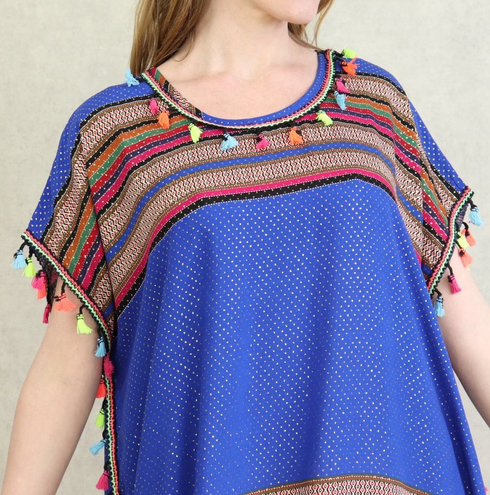 Robe orientale longue riche en couleurs, avec rayures horizontales multicolores sous forme d'arc-en-ciel, des petits pompons multi-couleurs sur toute la longueur des deux côtés et au niveau du col. Tissu pailleté offrant un effet d'étoiles dans le ciel de la nuit pour toute la robe ! Coupe droite, col rond. On aime son tissu de qualité au tombé fluide et confortable. Agréable robe d'été recommandée.