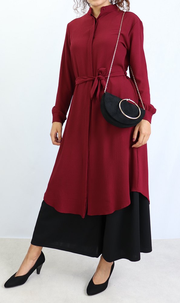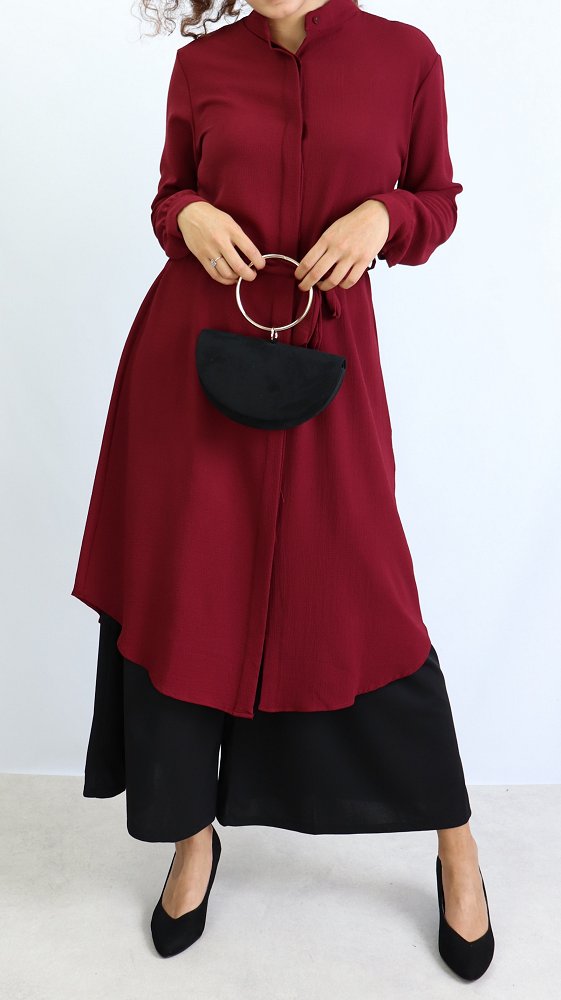 Très belle chemise longue sous forme de tunique, col officier, manches longues finition boutons aux poignets, extrémités arrondies. Coupe légèrement évasée, avec une ceinture assortie. Ce modèle reste un basique et indémodable qui se porte en toute saison et diverses.