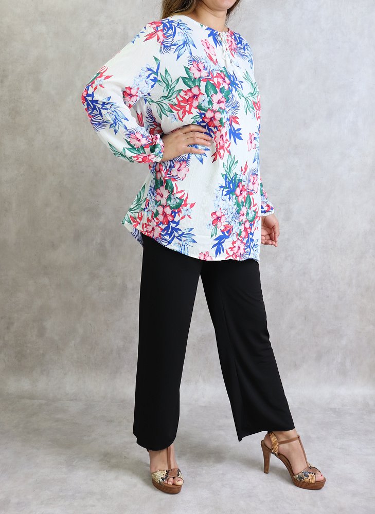 Tunique courte, col dégagé, lien de serrage, manches longues finition élastiques aux poignets. Coupe droite, tissu fluide et léger.