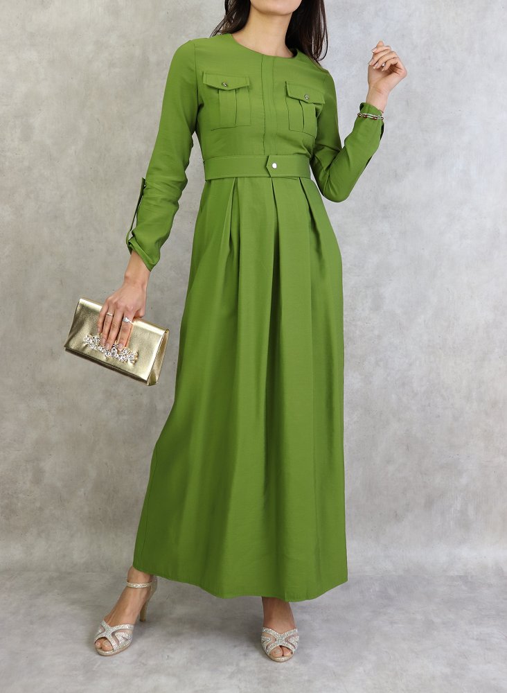 Robe longue, col rond, fermeture glissière au dos, manches finition retroussable, deux poches plaquées sur le buste, taille cintrée, large ceinture assortie.