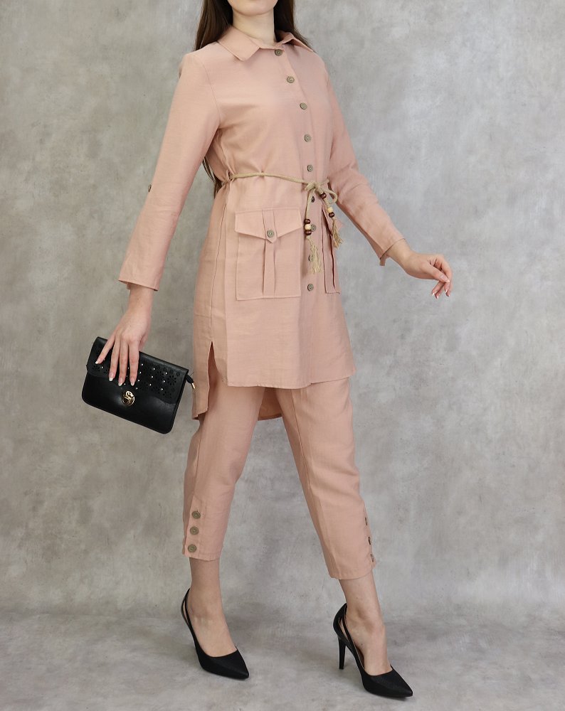 Ensemble 2 pièces. Veste : mi longue, col chemise, fermeture boutons, manches ajustables, ceinture tressée ornée de perles en bois, 2 poches plaquées à rabats. Pantalon : coupe droite, fermeture à glissière, boutons sur le bas. Tissu léger et opaque, effet tissé.
