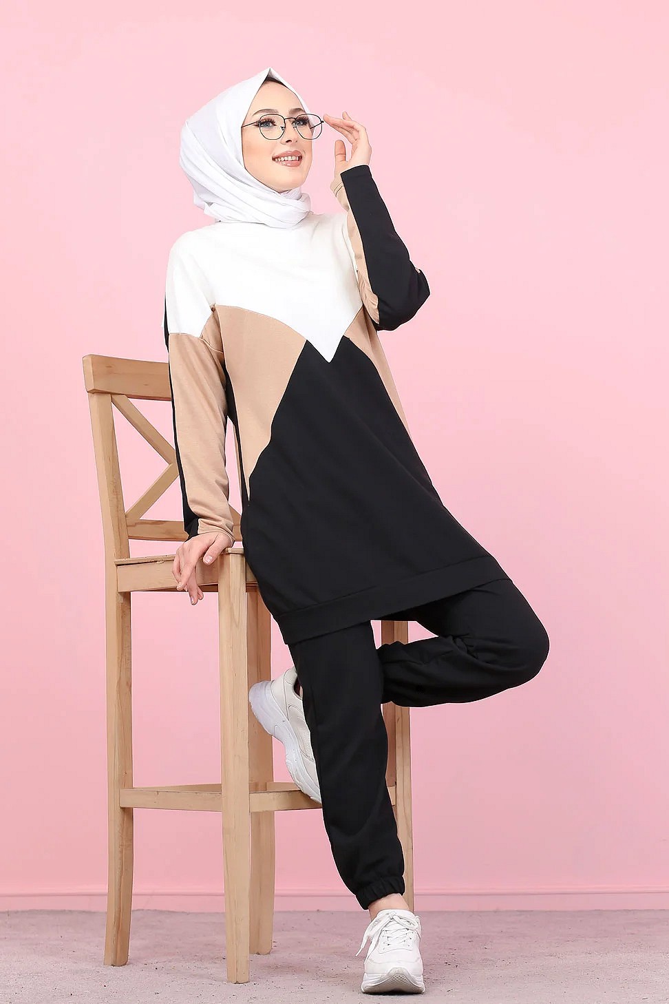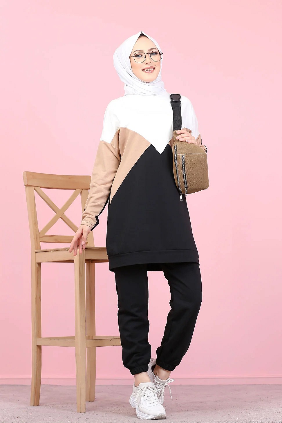 Tenue décontractée deux pièces (Pantalon jogging et Tunique) pour femme voilée - Ensemble sportswear à 3 couleurs : noir, beige et blanc Vetement & Accessoire