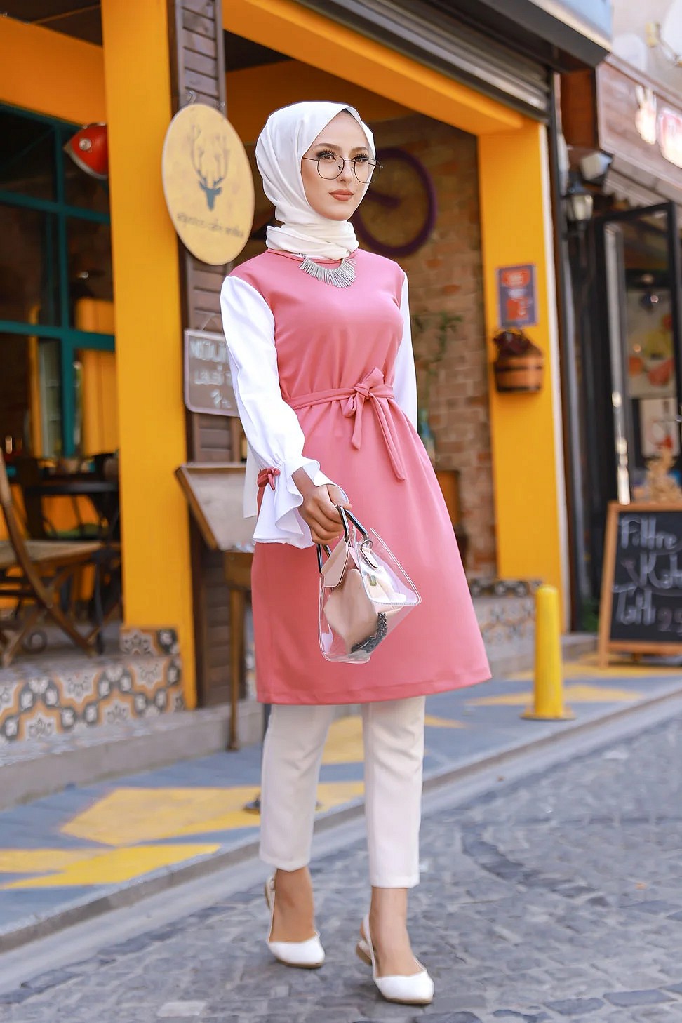 Tunique imprimée Joker - Sweat long à capuche (Mode pour jeune femme musulmane) - Couleur rose poudré - REF. 36029 (19.00 €)