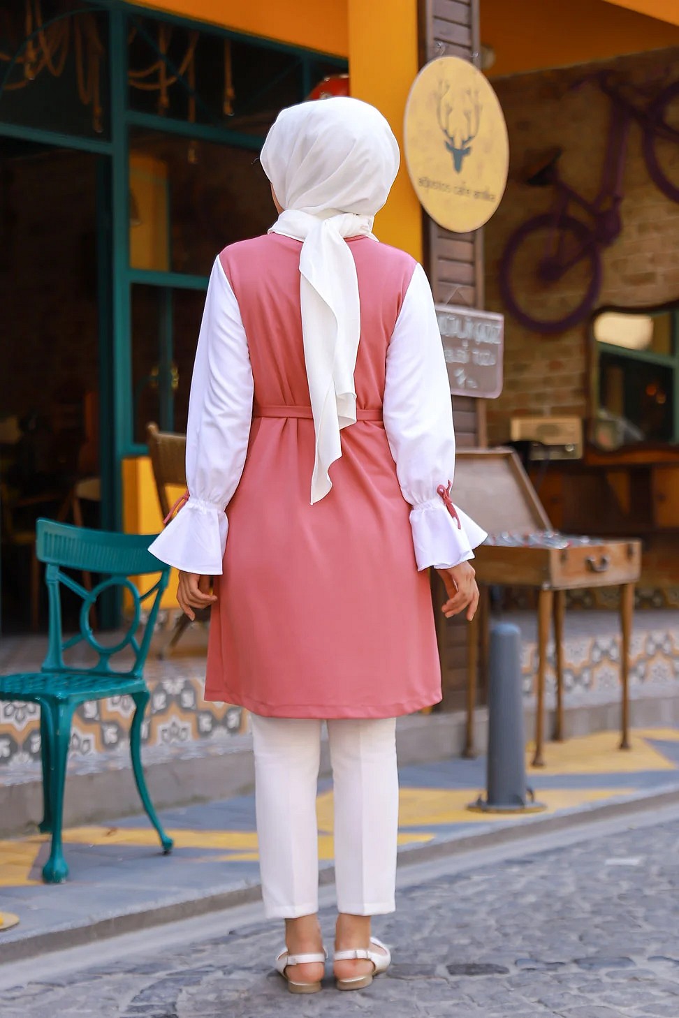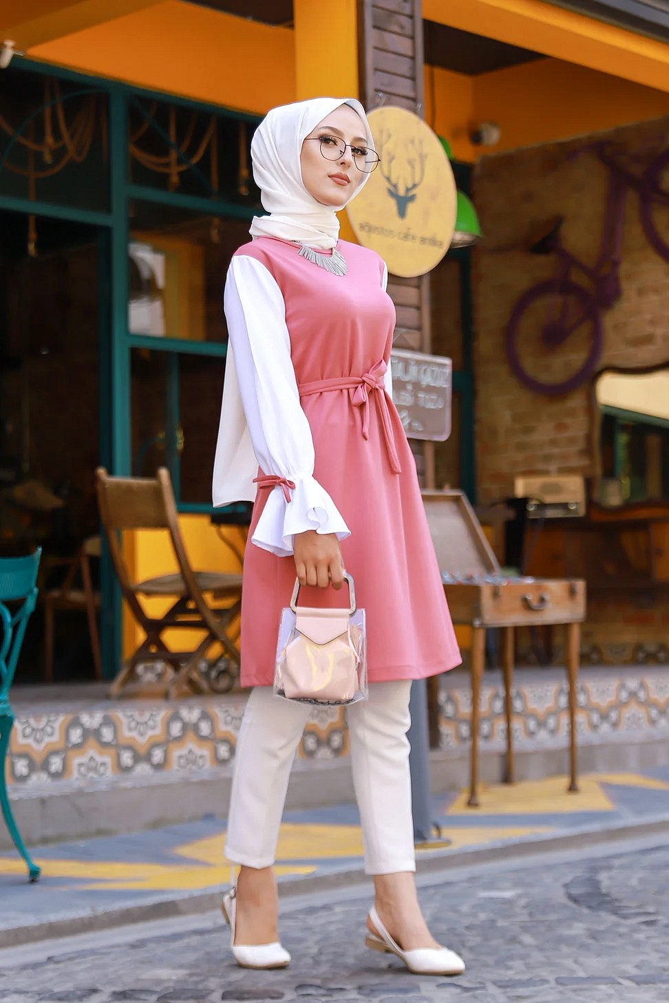 Tunique a volants (Vetement Hijab pour femme voilee) - Couleur framboise et blanc