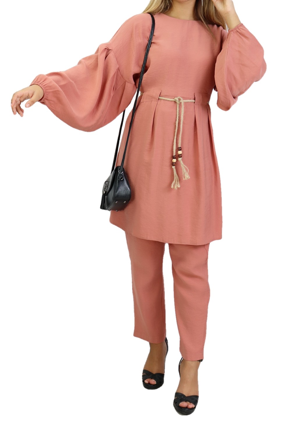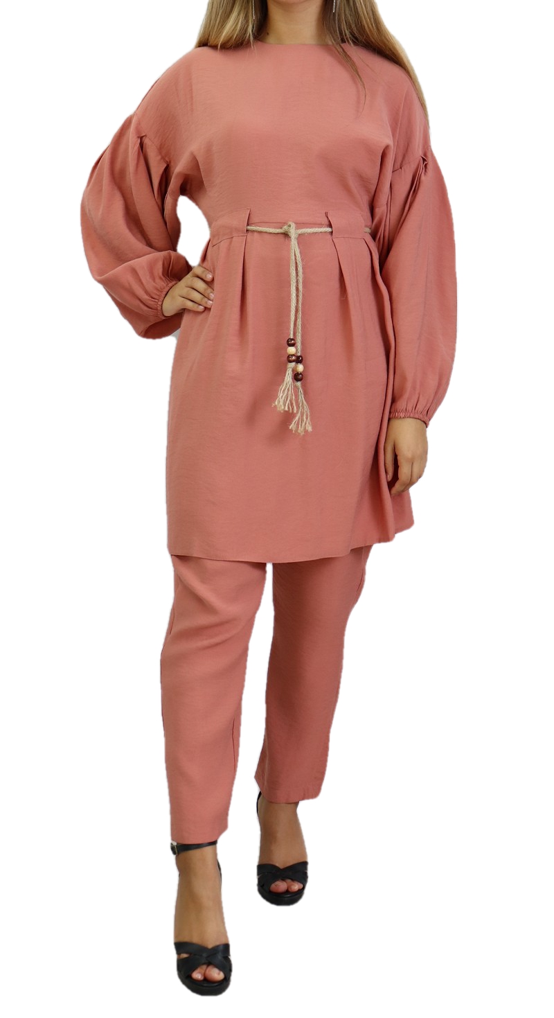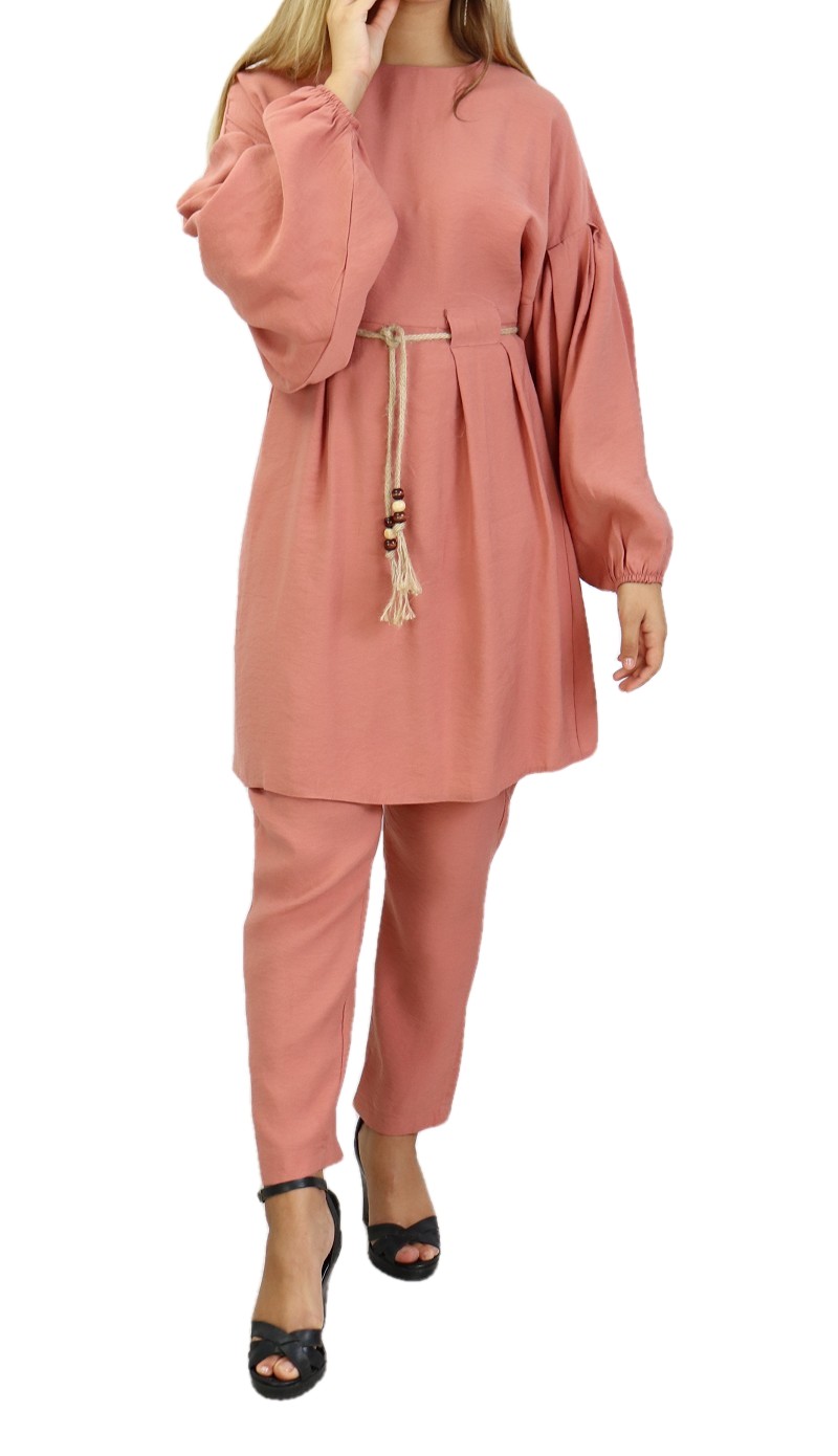 Ensemble 2 pièces femme. Tunique : mi longue, col rond, manches bouffantes finition élastiques aux poignets, fermeture glissière au dos, taille cintrée, ceinture à passant tressée et ornée de perles en bois. Pantalon : coupe classique, fermeture zippée. Tissu fluide et agréable au toucher.