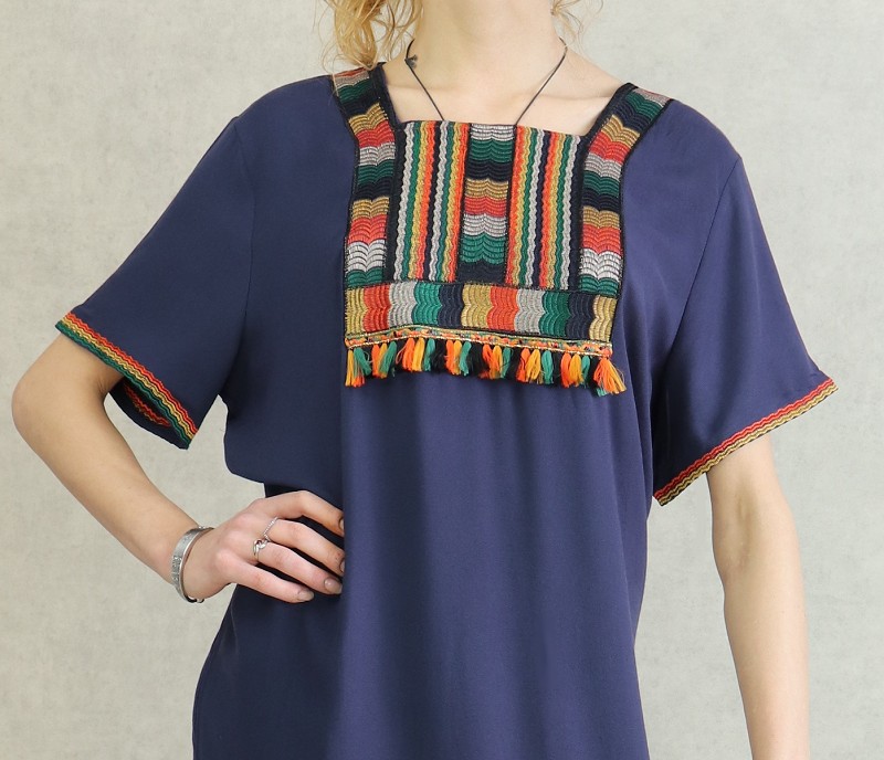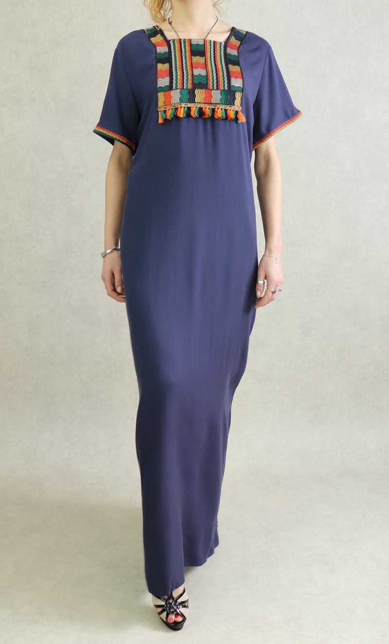 Robe de maison / d'ete longue a manches courtes avec broderie originale pour femme - Couleur Bleu marine