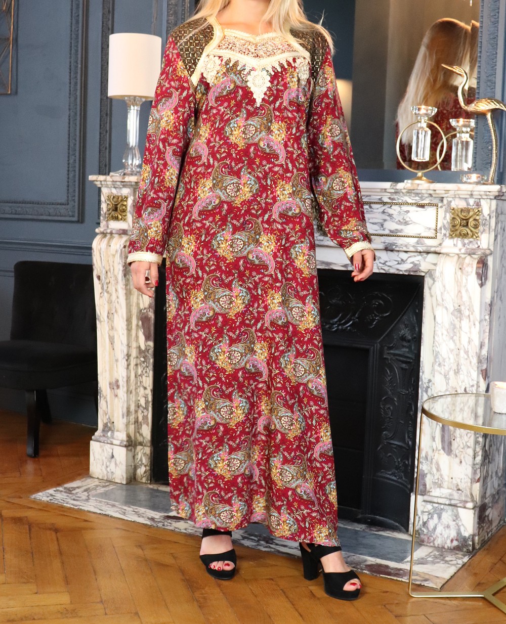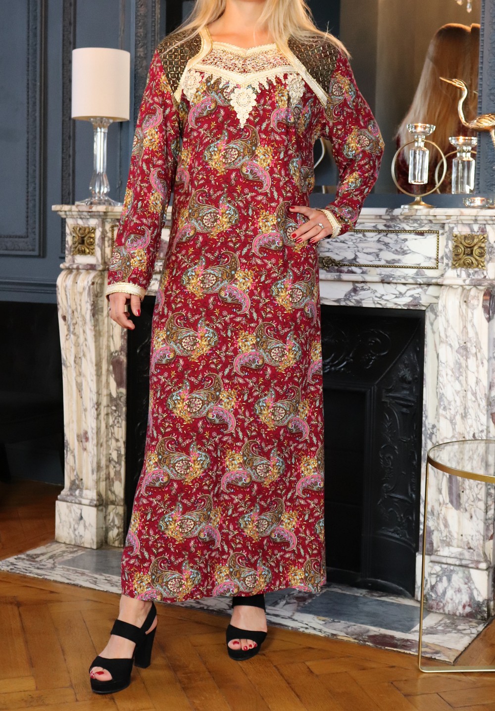 Robe longue brodee a motif cachemire pour femme - Couleur Bordeaux