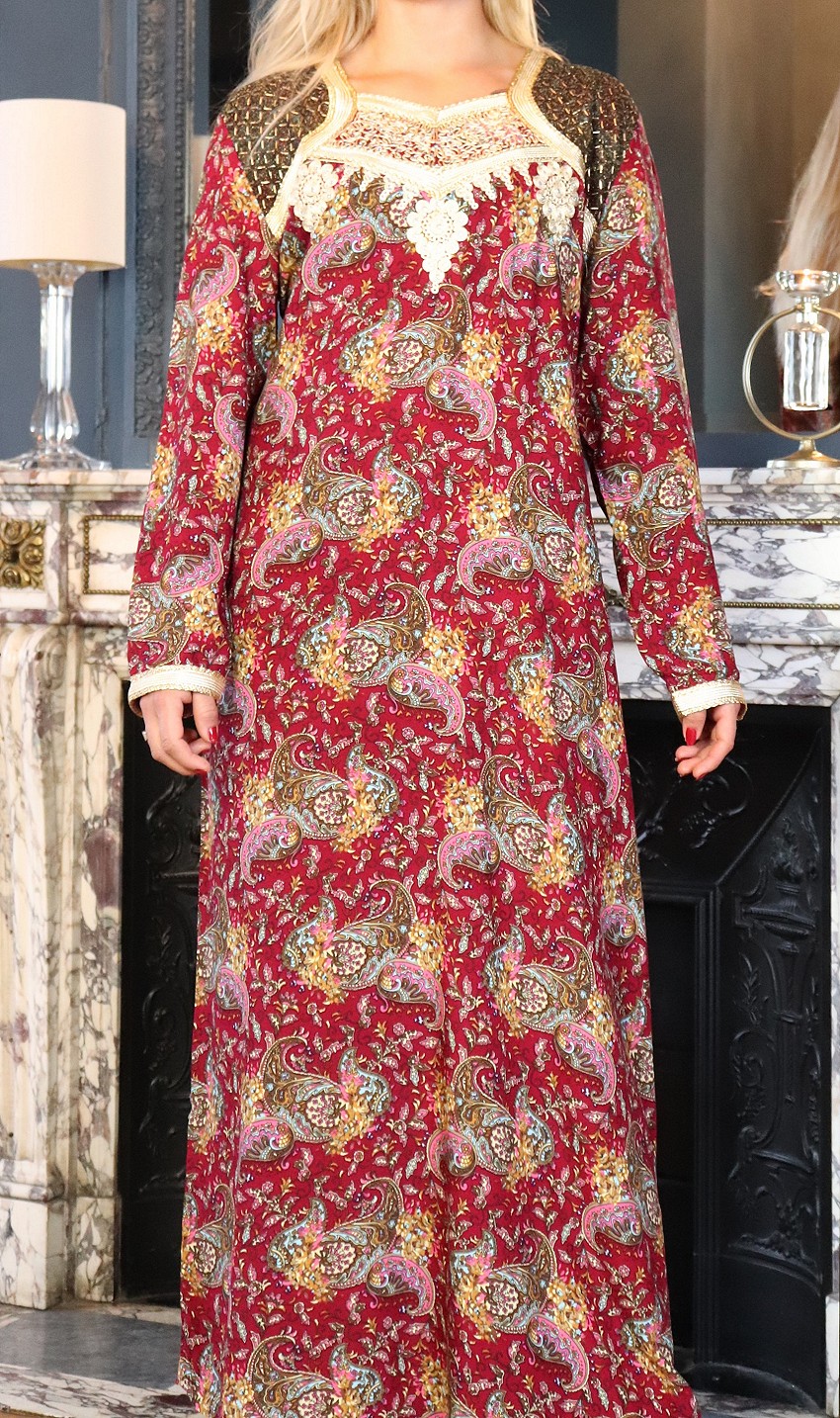 Robe orientale longue fleurie imprimée arabesque et brodée pour femme - Couleur Rouge - REF. 30948 (26.00 €)