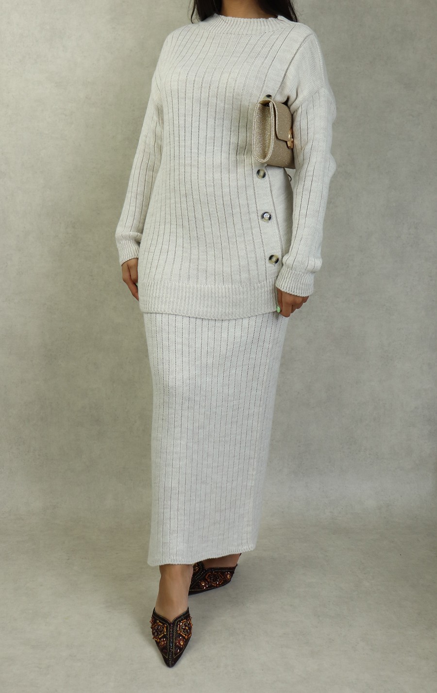 Ensembles deux pieces Tunique et Jupe en grosse mailles pour femme - Couleur Creme