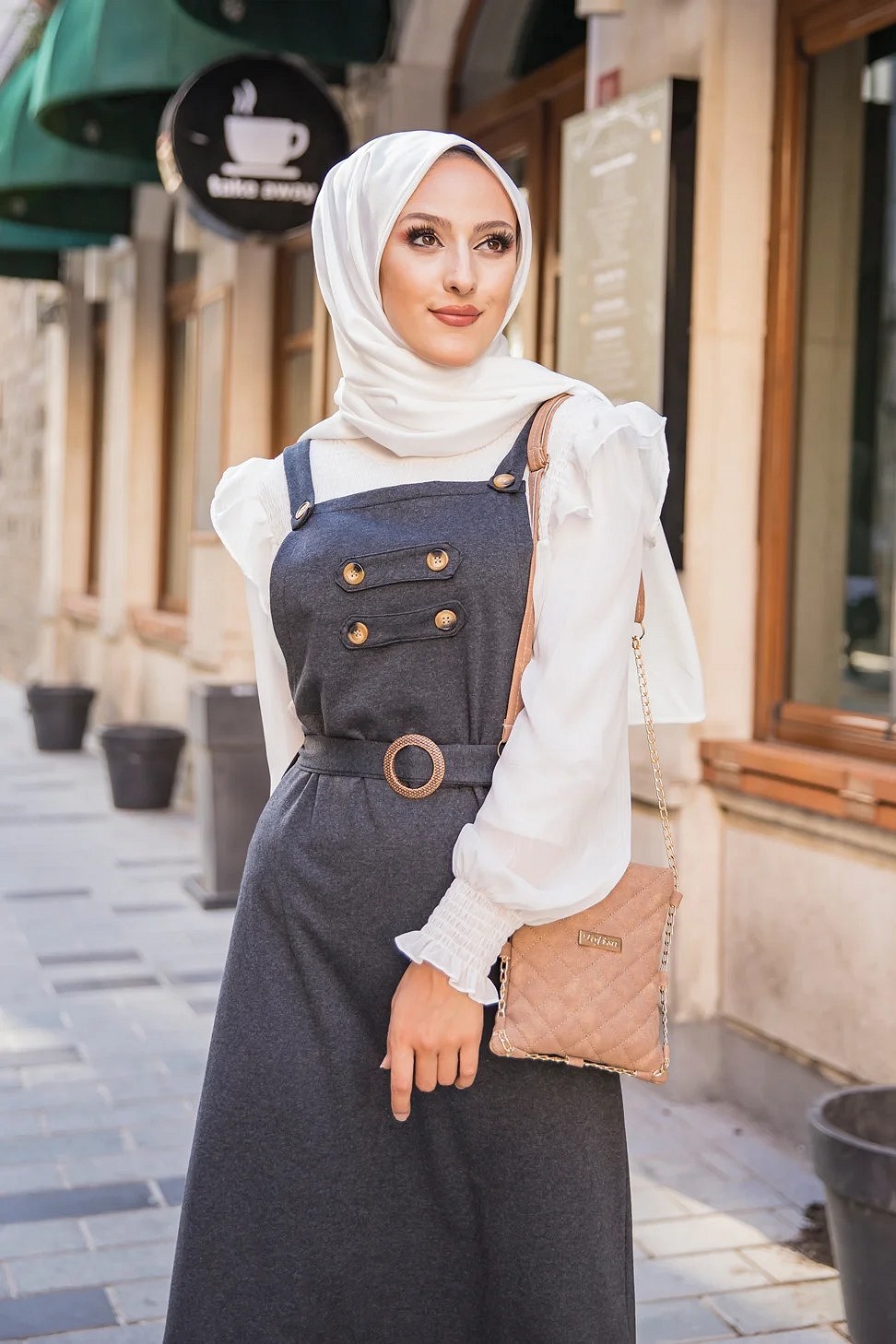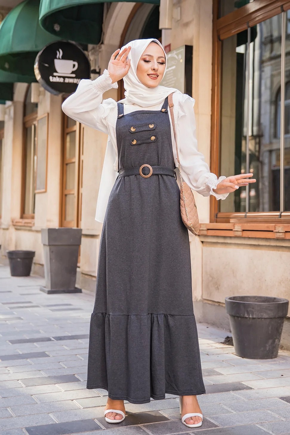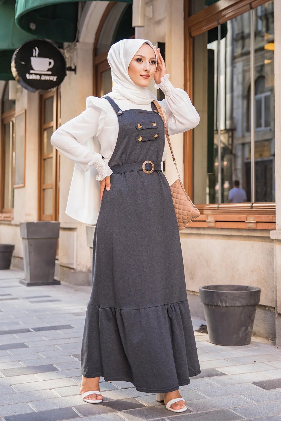 Robe bretelle (Salopette ) et sa ceinture assortie pour femme (Vetement hijab en ligne) - Couleur anthracite (gris fonce chine)