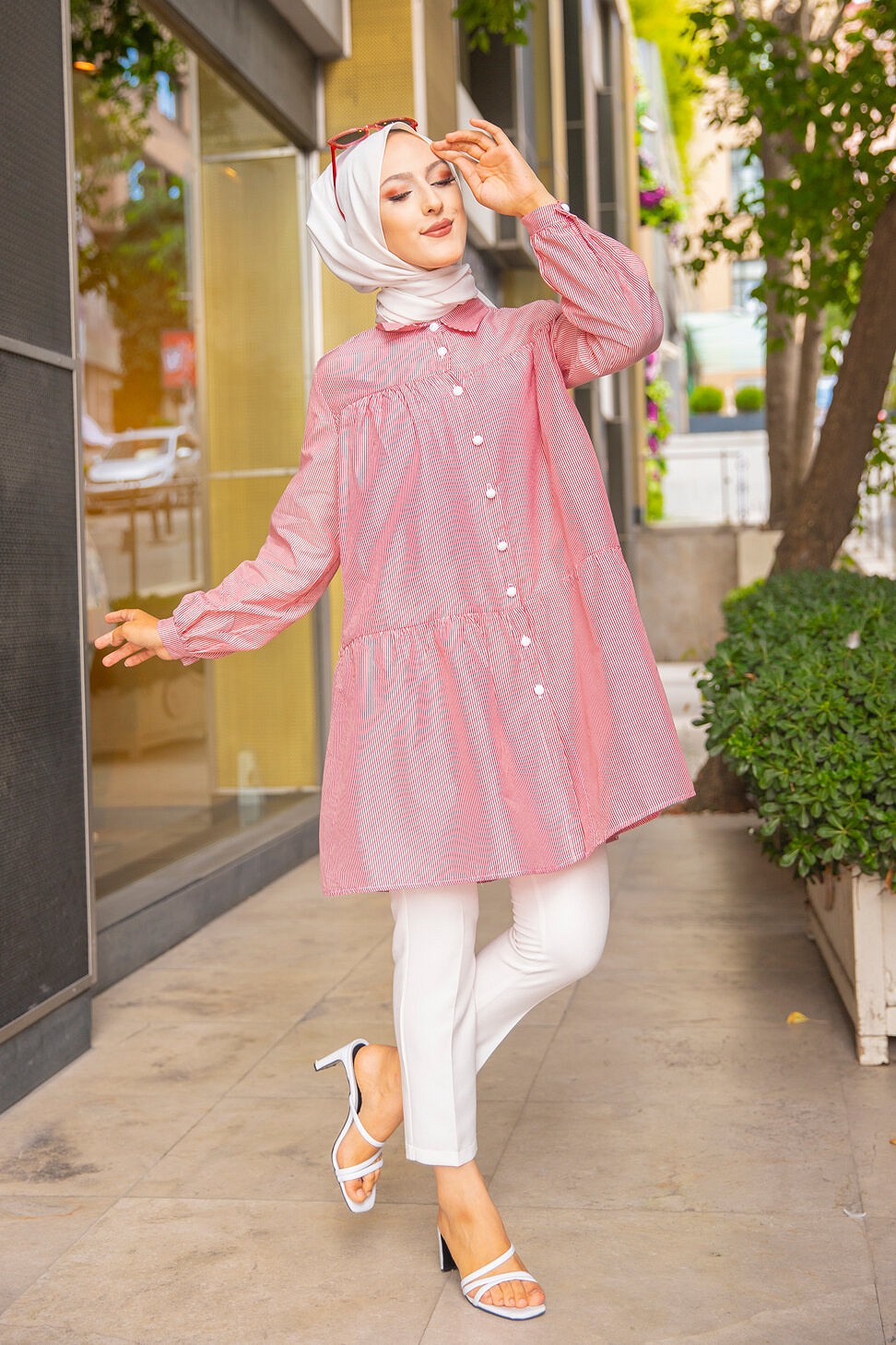 Chemise-Tunique ample a rayures bordeaux (Modest Fashion) - Couleur rose
