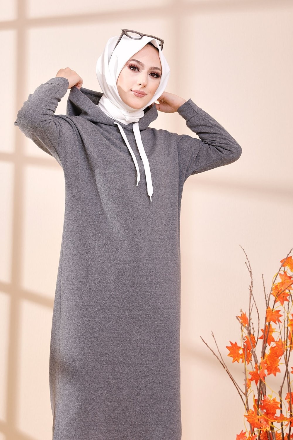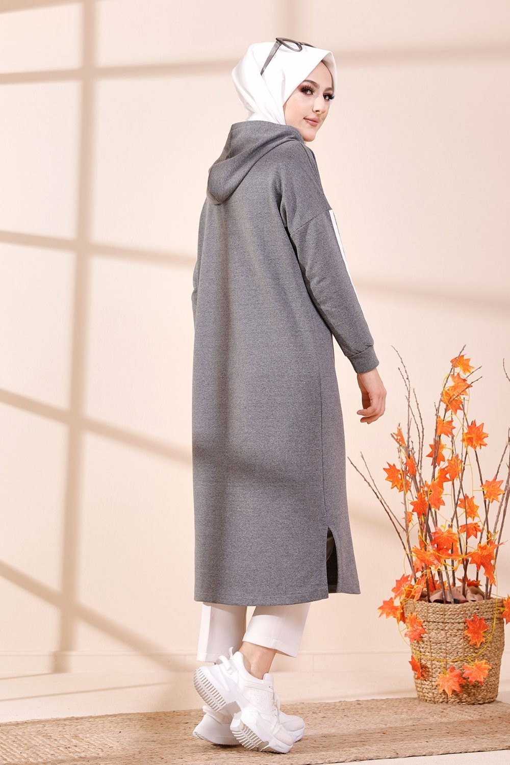 Tunique type sweat long à capuche (Vêtement moderne décontracté pour Hijab) - Couleur gris - REF. 35423 (22.00 €) - En Promotion à 16.90 €