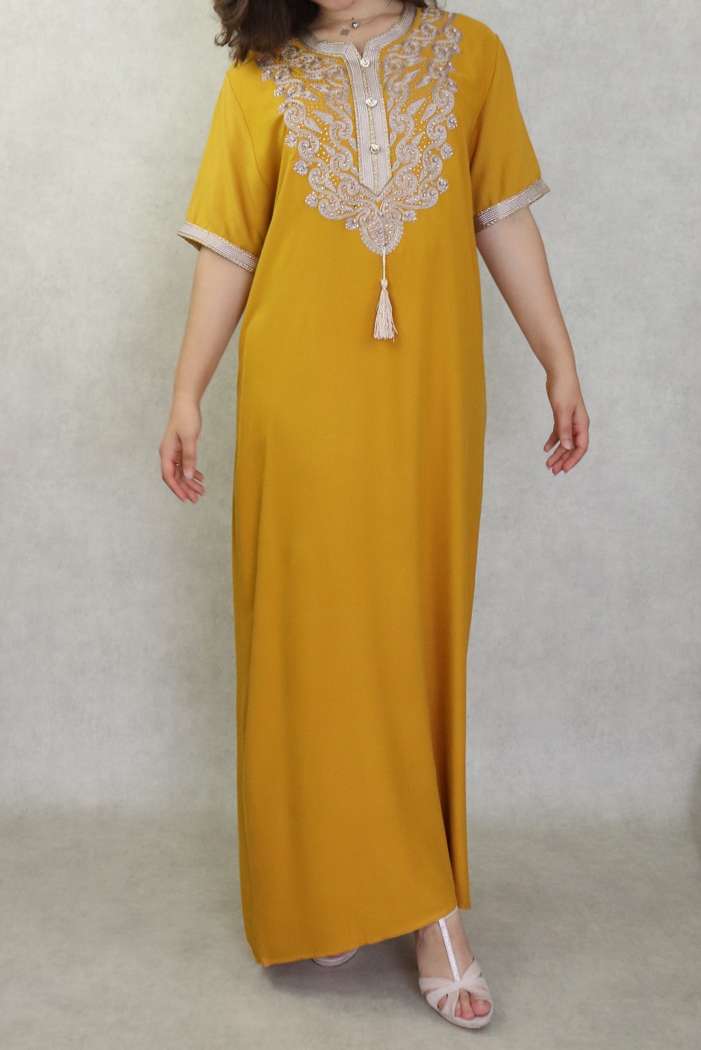 Robe femme style oriental arabe brodee avec perles manche courte - couleur jaune moutarde