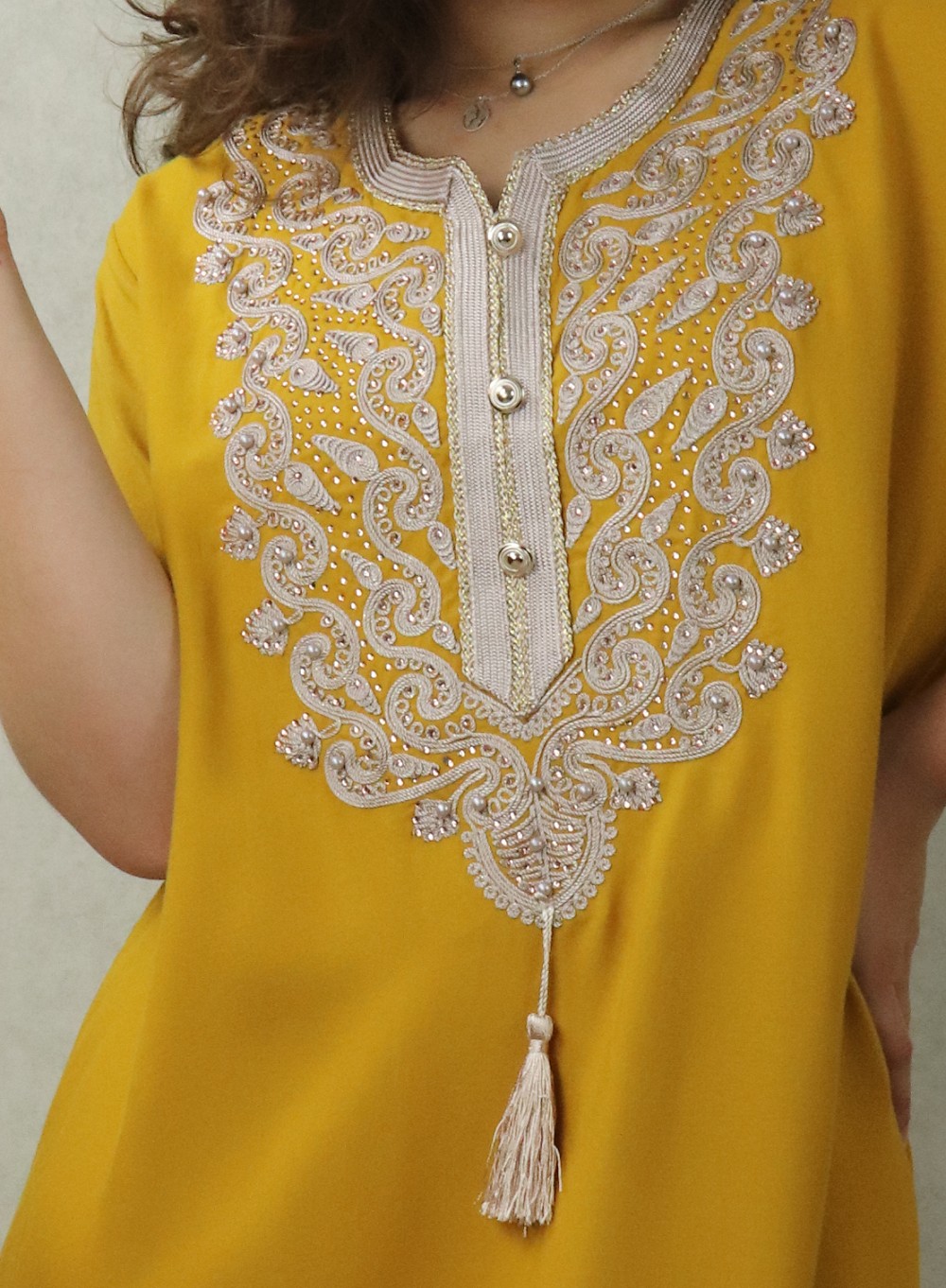 Robe femme style oriental arabe brodée avec perles manche courte - couleur jaune moutarde Vetement & Accessoire