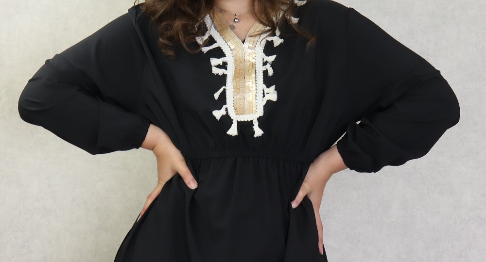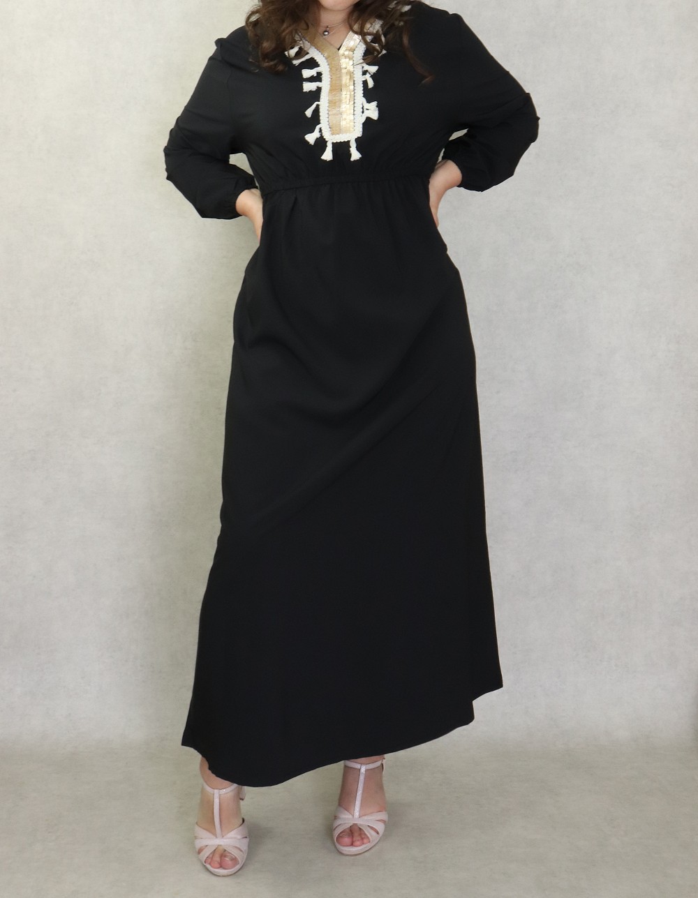 Robe longue féminine avec décoration écailles dorées et pompons - Couleur Noir Vetement & Accessoire