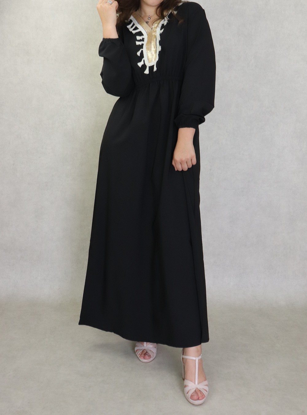 Robe longue habillée et chic avec perles (Vêtement mastour classe pour femme voilée) - Couleur noir - REF. 35989 (36.00 €)