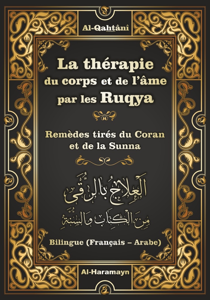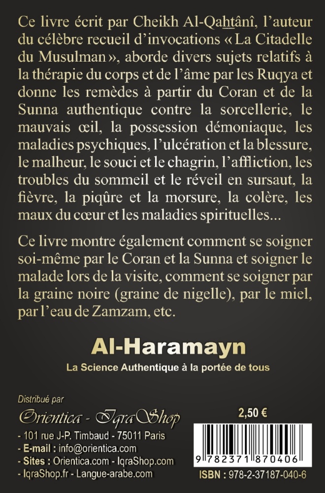 Ce livre écrit par Cheikh Al-Qahtânî, l’auteur du célèbre recueil d’invocations « La Citadelle du Musulman », aborde divers sujets relatifs à la thérapie du corps et de l’âme par les Ruqya et donne les remèdes à partir du Coran et de la Sunna authentique contre la sorcellerie, le mauvais œil, la possession démoniaque, les maladies psychiques, l’ulcération et la blessure, le malheur, le souci et le chagrin, l’affliction, les troubles du sommeil et le réveil en sursaut, la fièvre, la piqûre et la morsure, la colère, les maux du cœur et les maladies spirituelles...