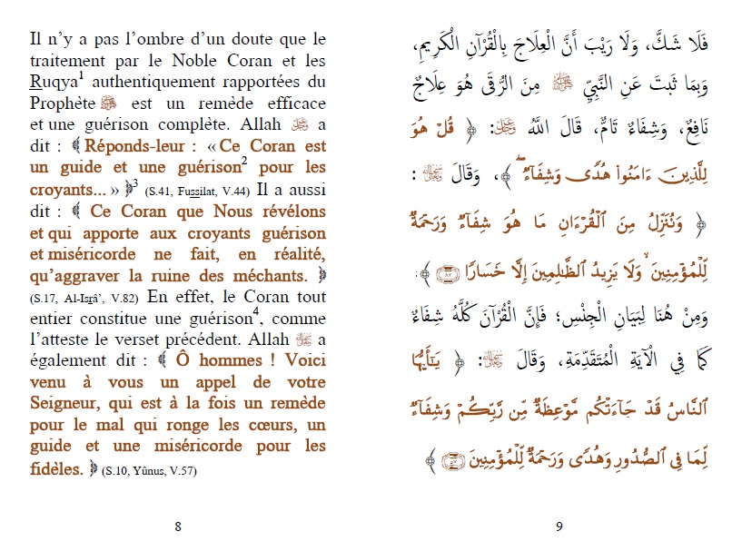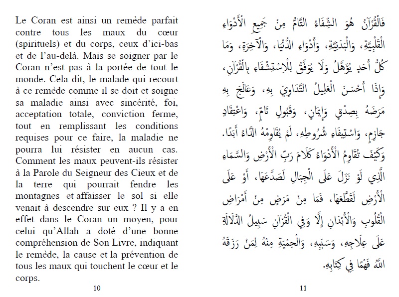 Livre bilingue (français/arabe), pages en vis à vis. Titre en arabe اَلْعِلَاجُ بِالرُّقَى مِنَ الْكِتَابِ وَالسُّنَّةِ.