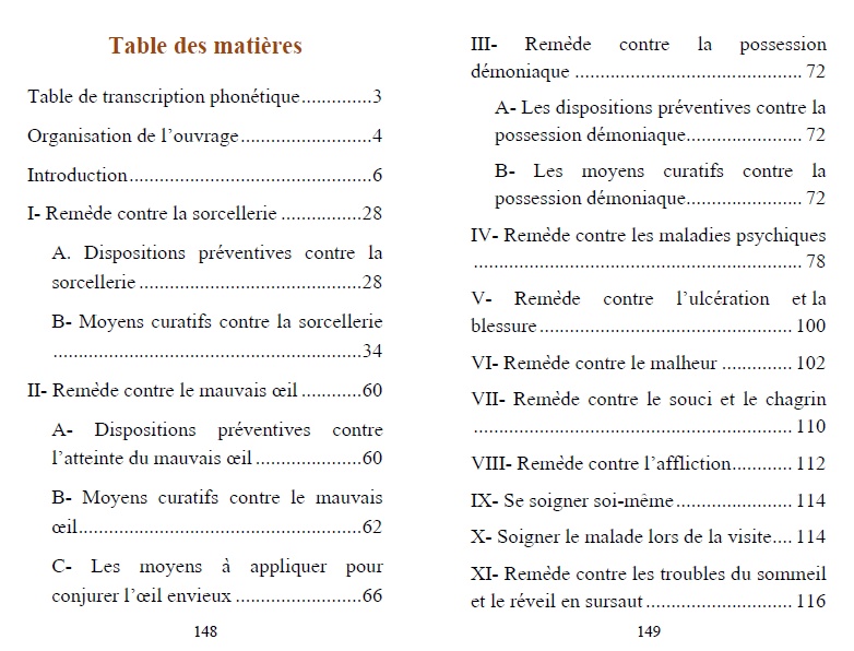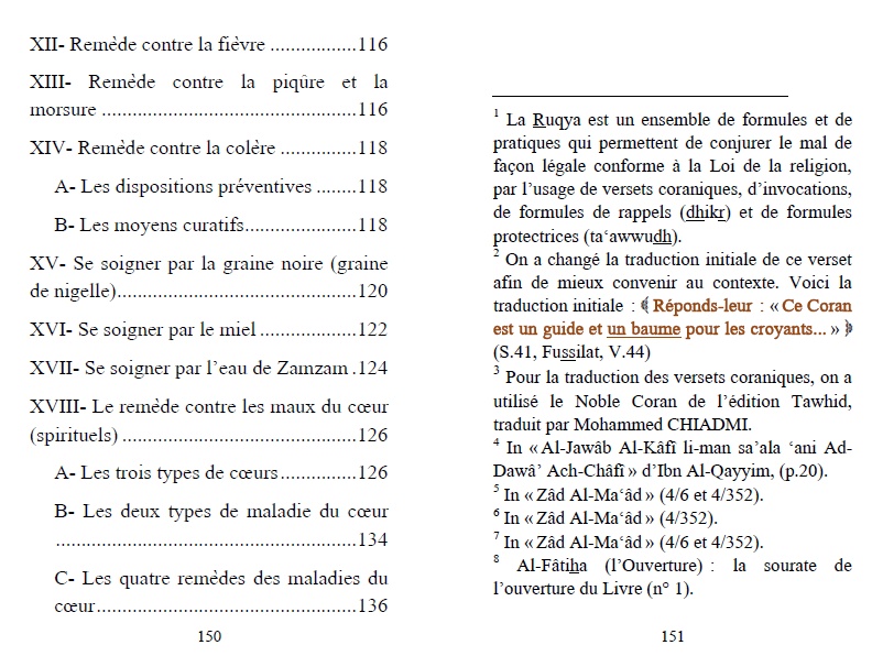 Ce livre montre également comment se soigner soi-même par le Coran et la Sunna et soigner le malade lors de la visite, comment se soigner par la graine noire (graine de nigelle), par le miel, par l’eau de Zamzam, etc.