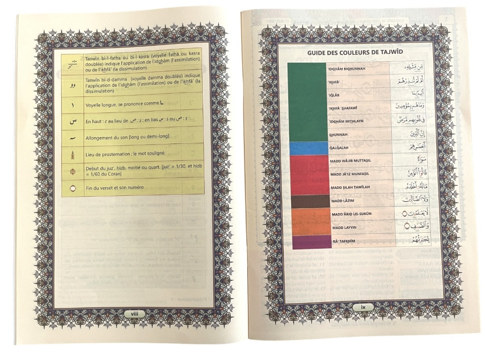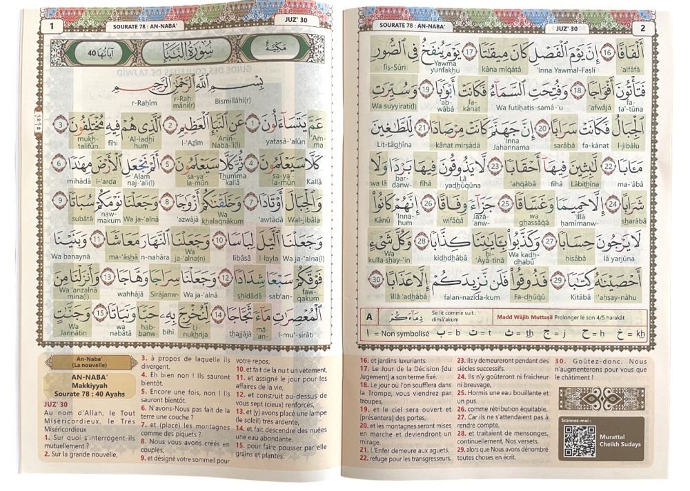 Les règles de tajwid sont données par un système de couleur intuitif pour apprendre les règles de lecture et de psalmodie du Saint Coran et le code QR (présent sur chaque page) permet d'ouvrir une vidéo sur son smartphone et d'écouter et suivre la lecture du Coran par cheikh Soudays.
