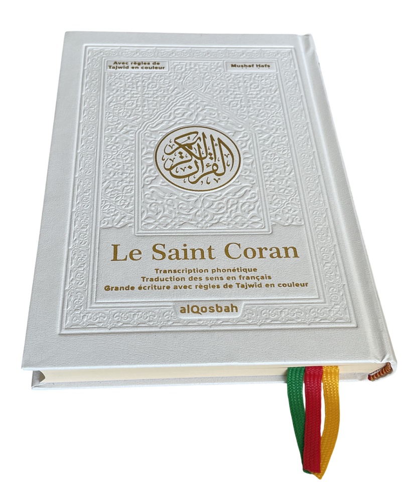 Version avec couverture cartonnée cuir de luxe blanche (16 x 21,5 cm), plus compacte (avec seulement 620 pages) et une taille d'écriture moyenne. Les trois marques pages (rouge, vert et jaune) vous permet de marquer et de réviser plusieurs sourates ou parties du Coran à la fois.
