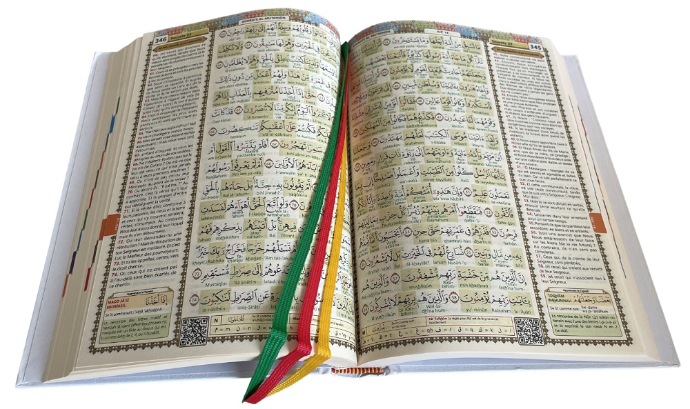 Les règles de tajwid sont données par un système de couleur intuitif pour apprendre les règles de lecture et de psalmodie du Saint Coran et le code QR (présent sur chaque page) permet d'ouvrir une vidéo sur son smartphone et d'écouter et suivre la lecture du Coran par cheikh Soudays.