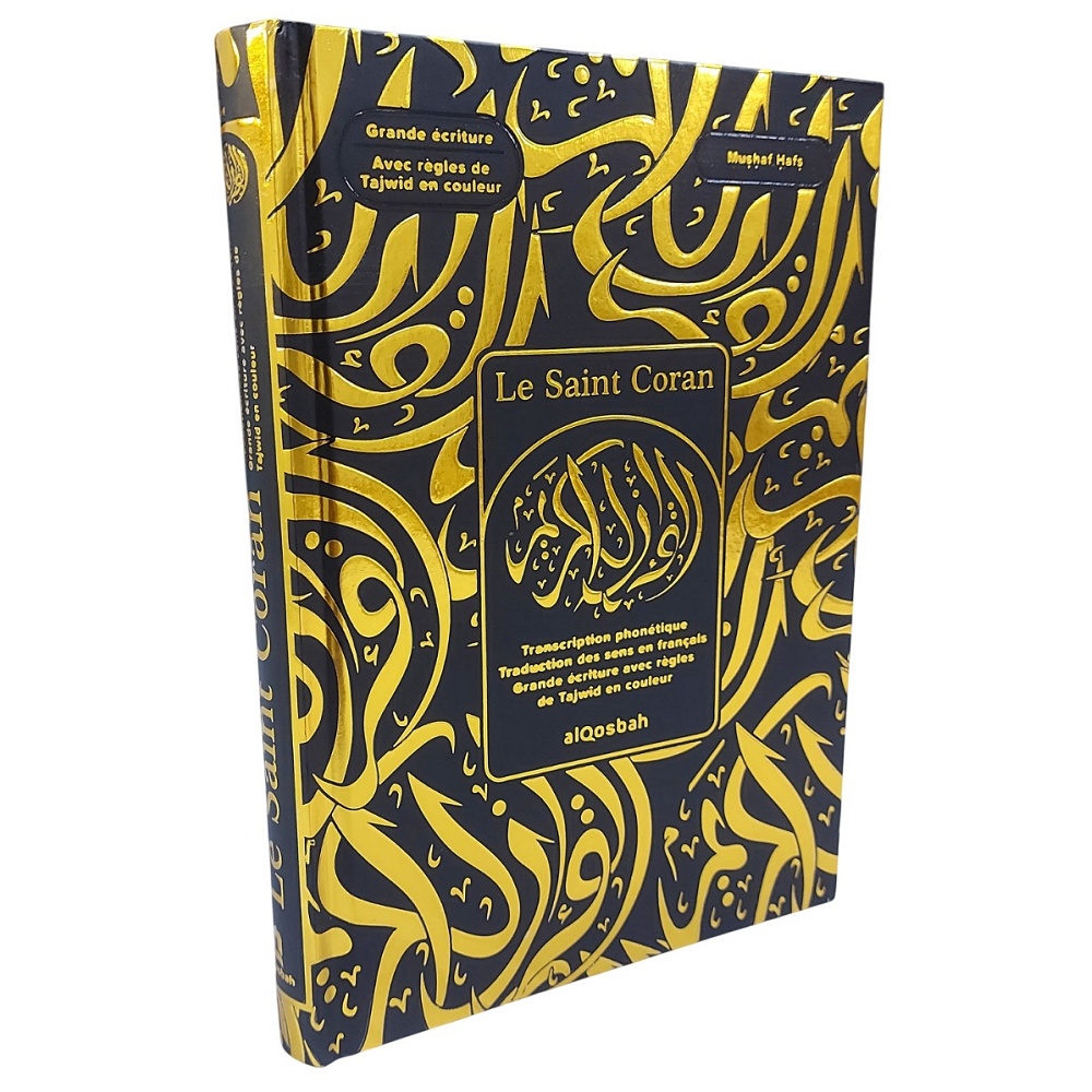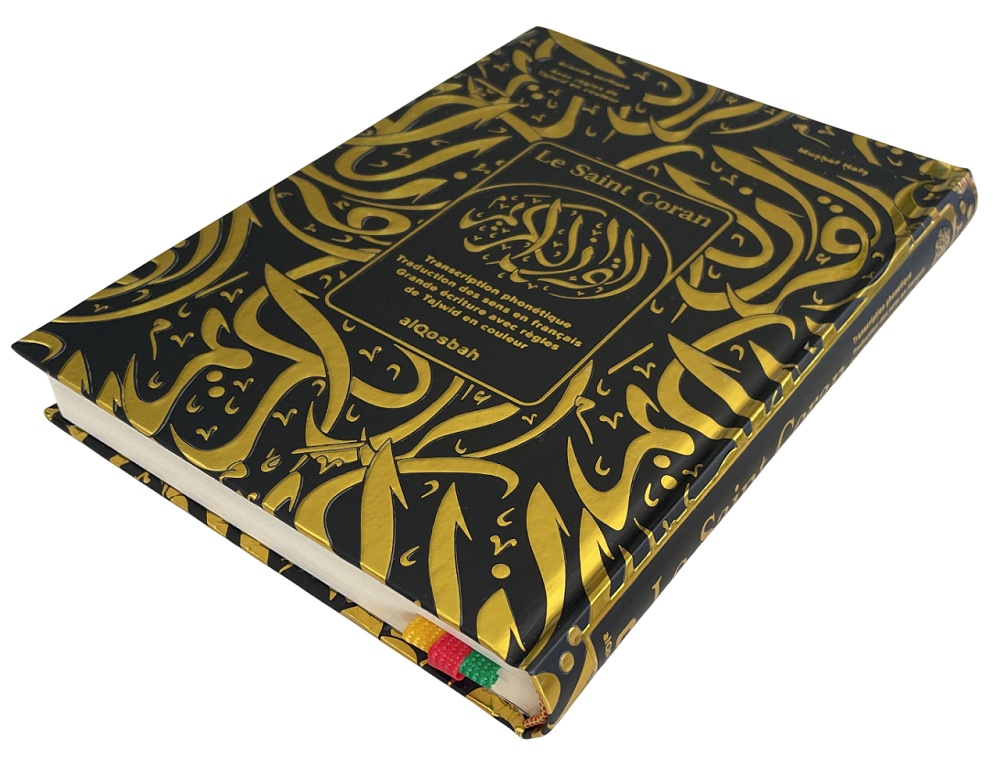 Le Saint Coran avec grands caractères - Transcription phonétique - Traduction des sens en français - Règles de Tajwîd en couleur - QR Code - Noir doré (13,5 x 18 cm) - REF. 40928 (29.90 €)
