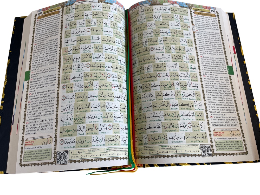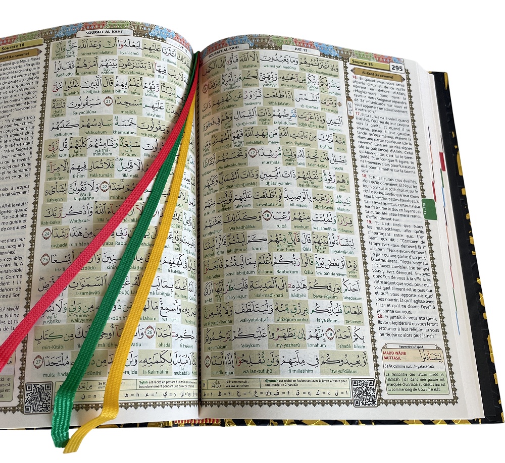 Les règles de tajwid sont données par un système de couleur intuitif pour apprendre les règles de lecture et de psalmodie du Saint Coran et le code QR (présent sur chaque page) permet d'ouvrir une vidéo sur son smartphone et d'écouter et suivre la lecture du Coran par cheikh Soudays.